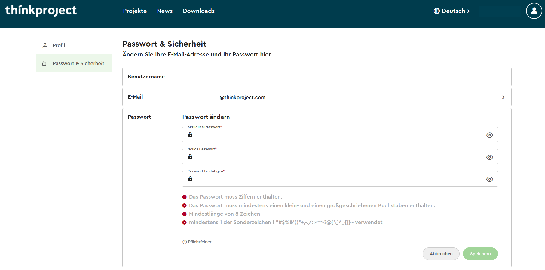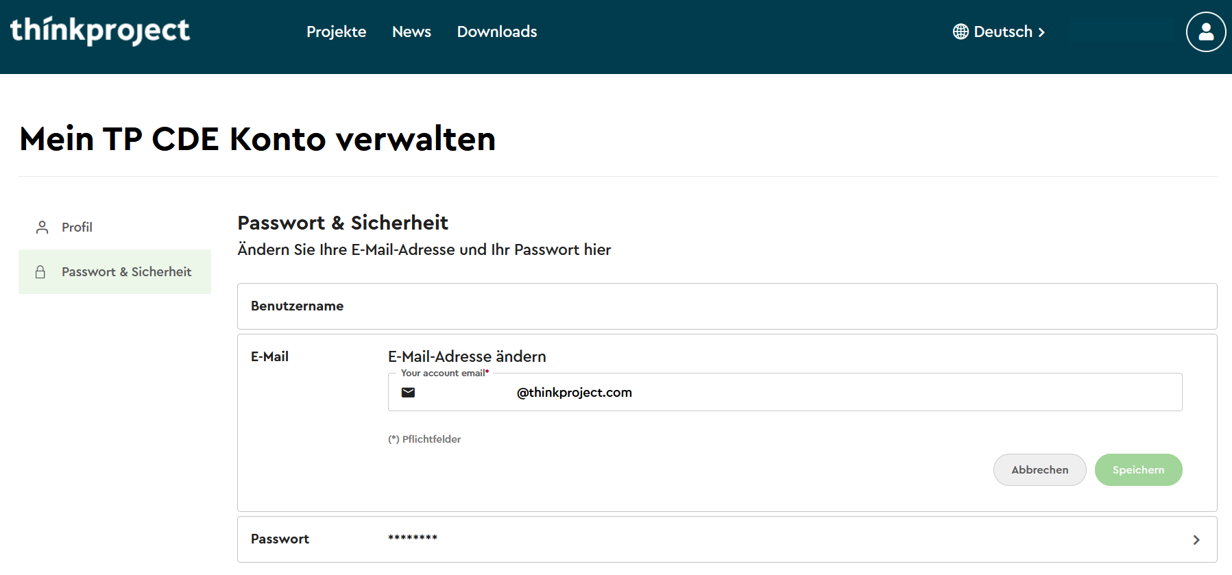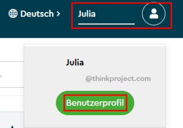Ihr Passwort und Ihre E-Mail Adresse ändern Sie in Ihrem Thinkproject Account (Übersichtsseite nach dem Login). Hierfür klicken Sie bitte auf den Mensch neben Ihr Name oben rechts und wählen im Dropdown Menü das Feld Benutzerprofil aus.