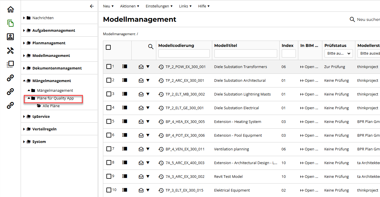 - Alle Pläne: Hier finden Sie in der Quality App gespeicherte Pläne. Sie können aufgenommene Mängel später direkt auf diesen Plänen markieren.