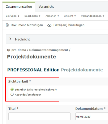 Alternativ haben Sie die Möglichkeit das Dokument als vertraulich zu klassifizieren, indem Sie die Einstellung Sender/Empfänger wählen. So wird das Dokument nur für die Teilnehmer sichtbar, die der Ersteller als Nachrichtenempfänger hinzugefügt hat. Es kann in Ihrem Projektraum bestimmte Teilnehmer geben, die Einsicht auf alle Dokumente haben.