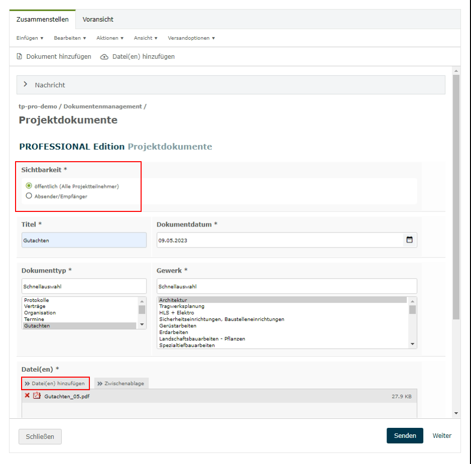 Das Dokument ist nun im System abgelegt und wird an alle Empfänger („An“ oder „z.K.“) gesendet. Ein nicht öffentliches Dokument kann nur noch vom Ersteller selbst und von Teilnehmern, die in die Kommunikation eingebunden sind, im Projektraum gesehen und bearbeitet werden. Öffentliche Dokumente finden Sie in dem entsprechenden Filter.