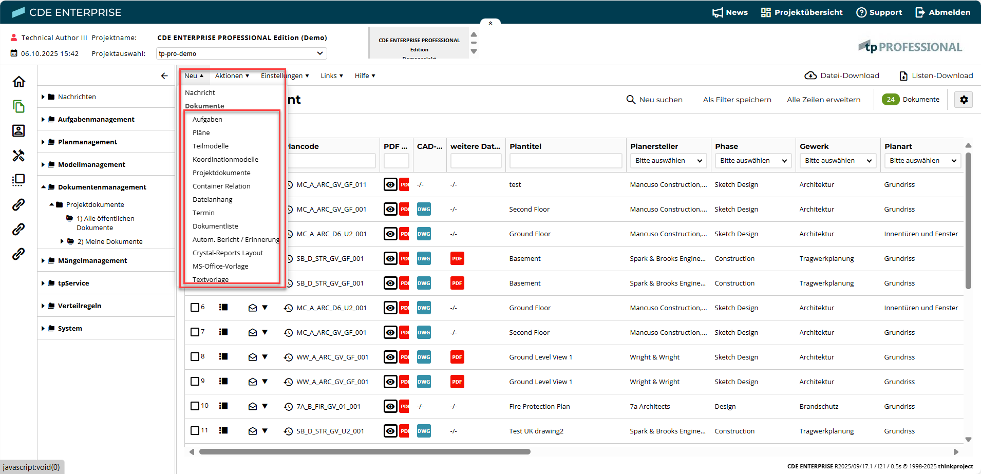 Um ein neues Dokument einzustellen, wählen Sie in der Menüleiste Neu - Projektdokumente.