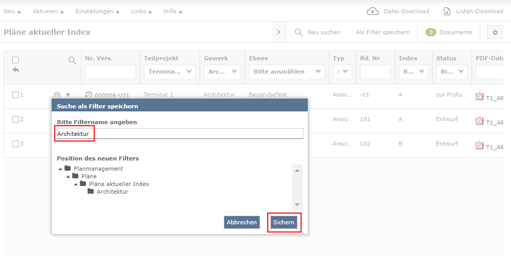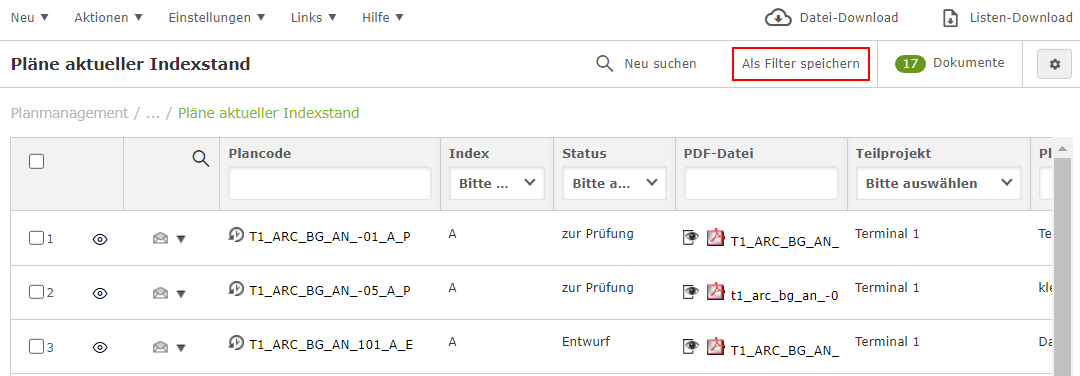 Wenn Ihr Suchergebnis geladen hat, werden die entsprechenden Dokumente/ Pläne in der Ansicht angezeigt. Wählen Sie nun oben rechts die Funktion Als Filter speichern aus.