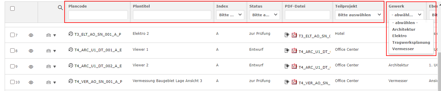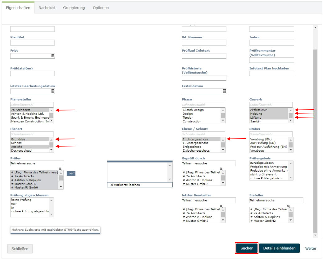 Der Vorteil dieser Suche ist, dass Sie bei der Eingrenzung von Auswahl- oder Kürzellisten nur Werte auswählen können, die bereits in den Projektraum hochgeladen wurden. Möchten Sie einen Wert durchsuchen, der im Auswahlmenü nicht verfügbar ist, wurde kein Dokument oder Plan mit diesem Wert bisher eingestellt.
