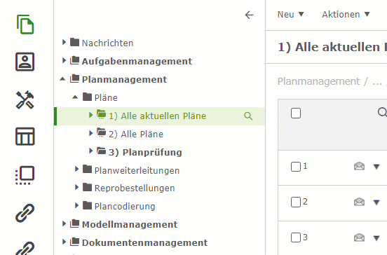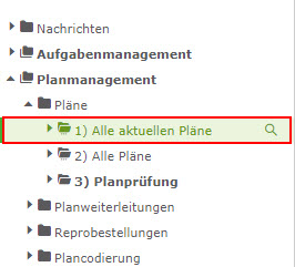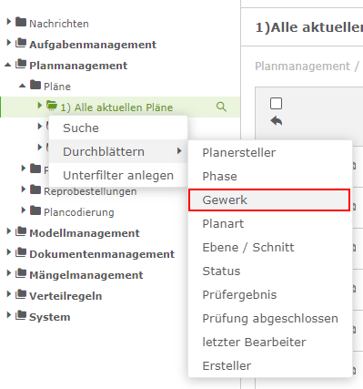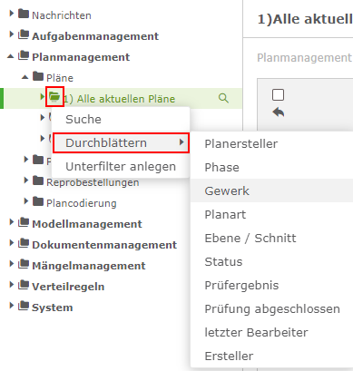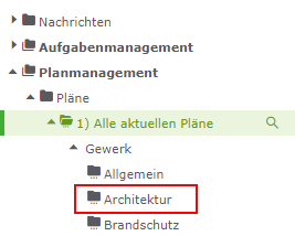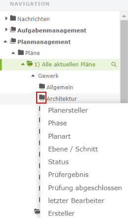 Klicken Sie einen dieser Werte an, dann erscheinen in der Übersicht (rechts) alle mit diesem Wert übereinstimmenden Pläne, hier z.B. Architektur.