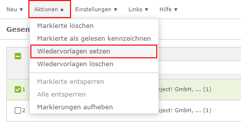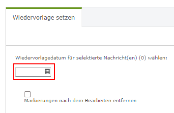 Markieren Sie die gewünschte Nachricht über die Checkbox vor dem Briefumschlag-Symbol und wählen Sie in der Aktionsleiste Aktionen und Wiedervorlage setzen aus.