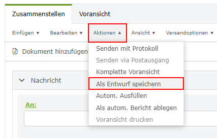 Über die Sende-Menüleiste Aktionen - Als Entwurf speichern, können Sie einen angefangenen Versand auch manuell sichern. Manuell gespeicherte Entwürfe werden vom System nicht automatisch gelöscht.