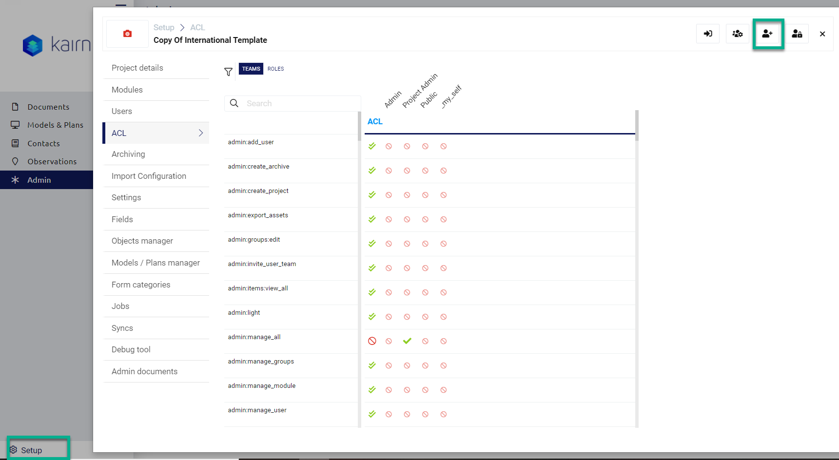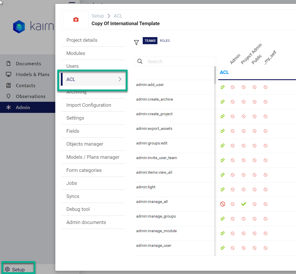Within each project, administrators can update the feature type capabilities for each user group from those copied from the template. These are managed within 2 areas: