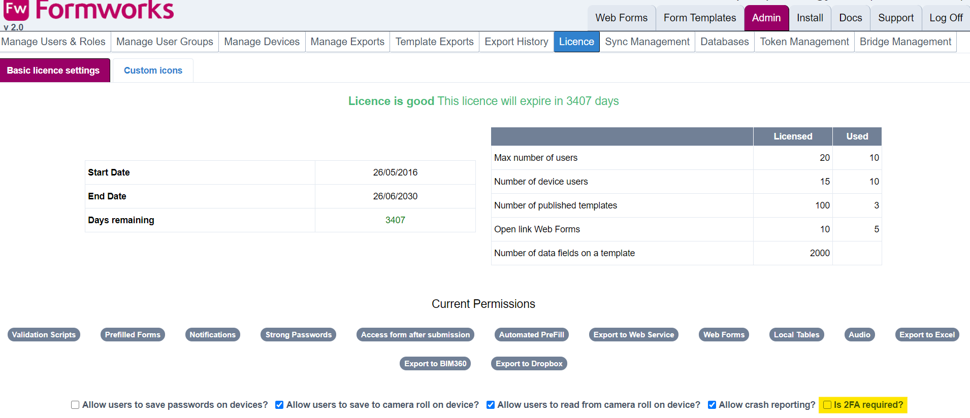 The 2FA setting can be found below Current Permissions on the Licence page, it is the last checkbox option (Is 2FA required?). By default this option is disabled. Once enabled there will be an additional System Role called ‘MFA’ visible on the Manage Users & Roles tab per user. A user will need this role enabled before two-factor authentication is required at their next login.