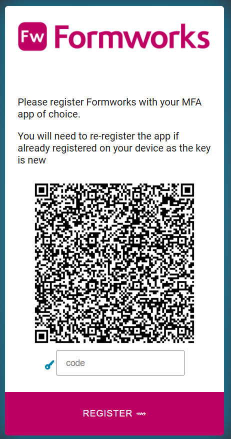 Enter the provided code in the given space below the QR code image and press ‘Register’. You will then be prompted to enter the code again (if the code on your authentication app has changed, please enter the updated code) and then press Login.