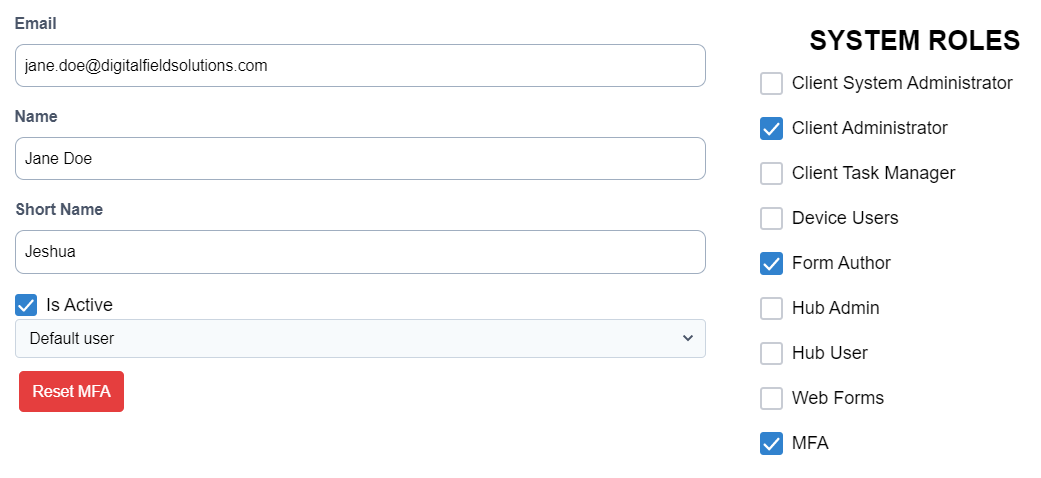 After a User has successfully logged into the FORMS Portal using 2FA, a ‘Reset MFA’ button will appear below User details in the Edit User screen.