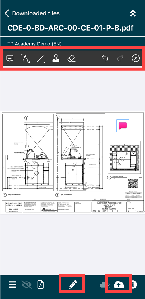 When you call up a file in your app, you have the option at the bottom of the page to make annotations in this plan with a click on the pencil symbol