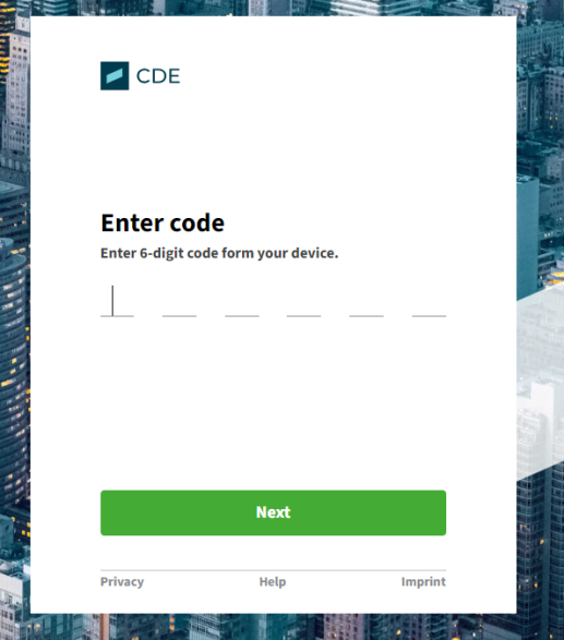 Once 2FA has been setup, you will be presented with the display below each time you log into Thinkproject CDE, after entering your username and password. Simply open your authenticator app and enter the 6 digit code provided.