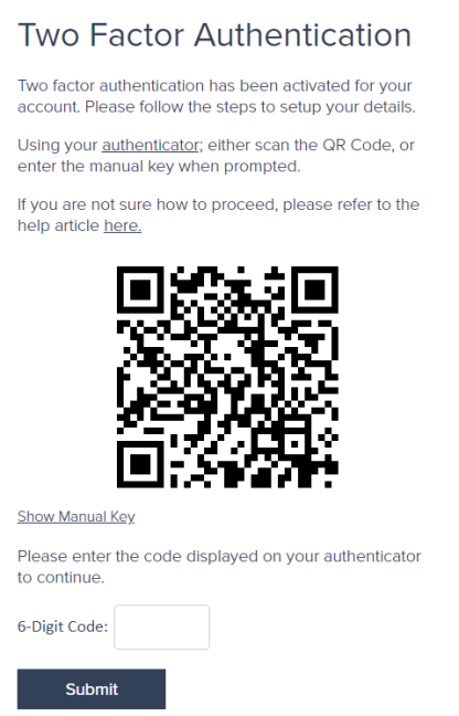 If 2FA has been enabled for your account you will be presented with the setup wizard below after logging in for the first time.