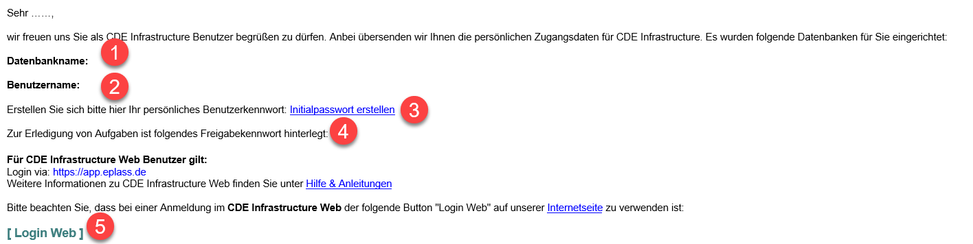 Nachdem Sie als Nutzer für CDE INFRASTRUCTURE Web angemeldet wurden, erhalten Sie eine E-Mail mit Ihren Zugangsdaten: