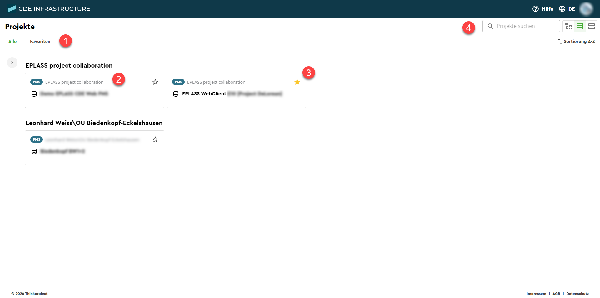1: Sie können die Ansicht der Projekte wählen. Entweder Sie lassen sich alle Projektdatenbanken anzeigen, auf welche Sie als User Zugriff haben oder Sie zeigen ausschließlich Ihre Favoriten an.