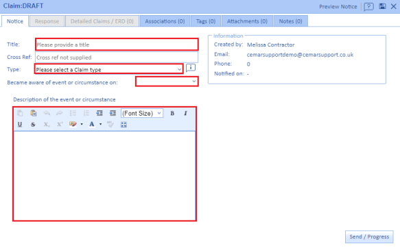 This will open a new window in which you may enter the title, type and details of the claim. The fields highlighted in red below are required to be filled in before the event can be communicated: