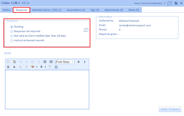 Selecting Send / Progress will communicate the detailed claim and it will now appear in the Employer's \reminders.