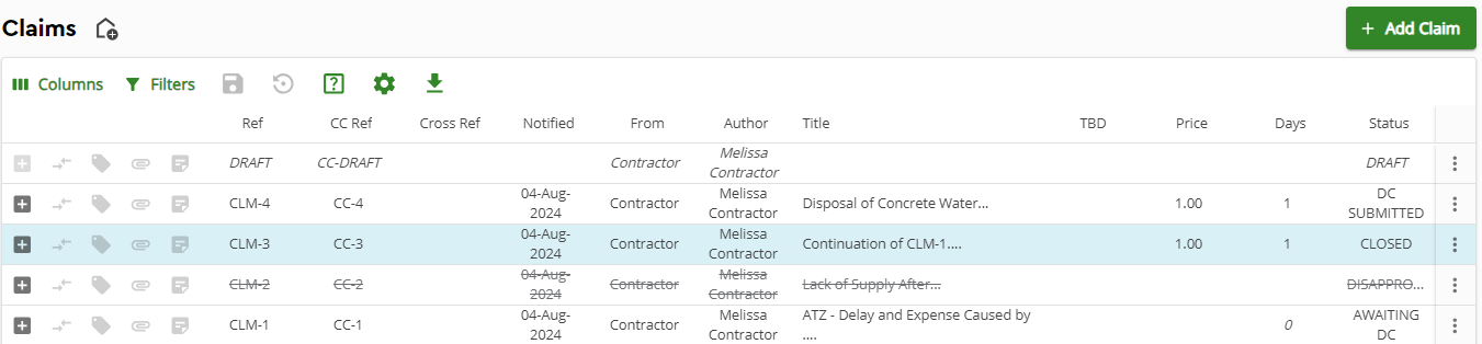 As well as a reference number for each event, claims are also given a change control reference, which is located in the CC Ref column.