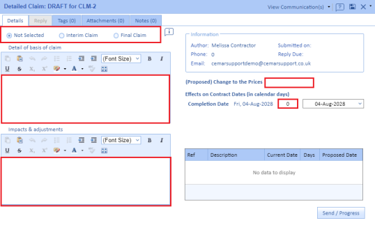 You will then be displayed with the below edit form in which you can enter the type, details and impacts of the claim. The fields outlined in red below are mandatory: