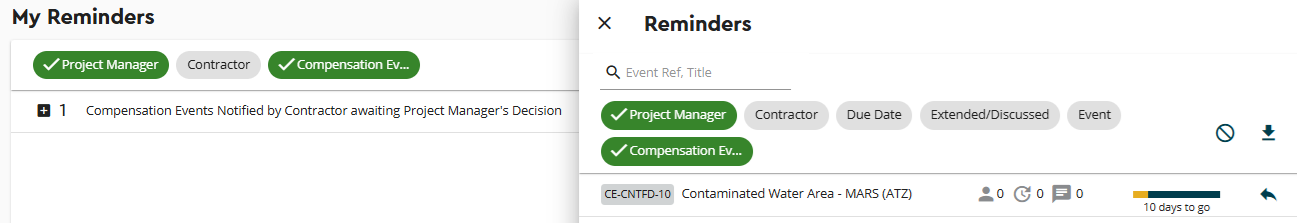 Any TO compensation events requiring action will appear on the reminders page with CEs for the main contract.