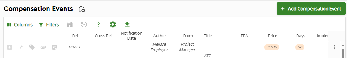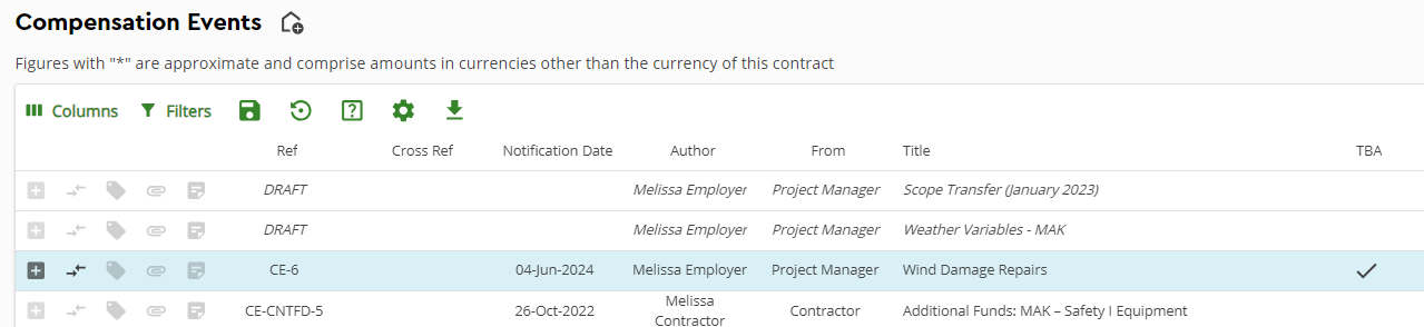 CEs can be created by either the Employer (PMI = Project Manager’s Instruction) or the Contractor (CE-CNTFD = Contractor Notified Compensation Event).
