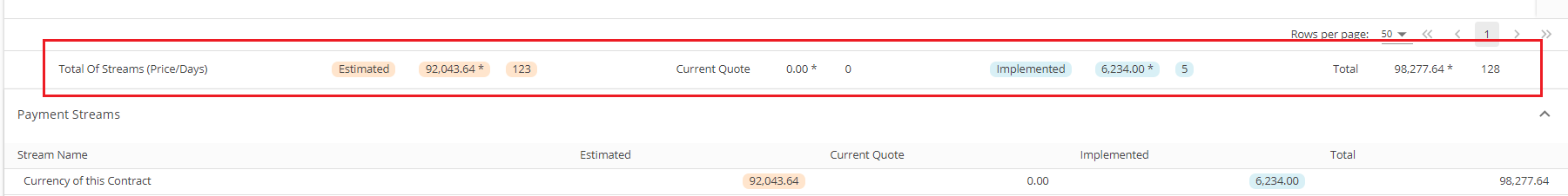 A Total of Streams bar is located at the bottom of the register, which displays cumulative amounts for the different quote stages. The total in amber is the estimated cumulative amount, which is only visible to the Employer’s Party: