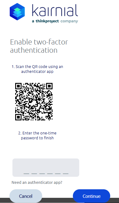 Scan the QR code with your application, enter the one-time password, then click on Continue.