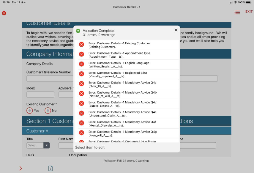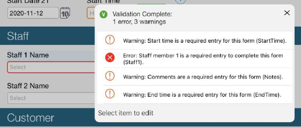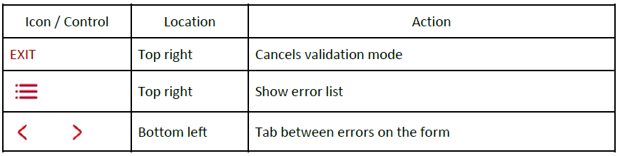 When the validation process runs, the App enters the validation mode, presents a list of errors and highlights, in red on the form template, data fields that have failed validation.