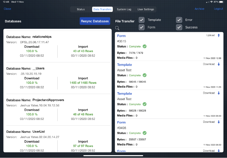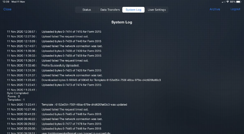 This is a simple, short term record of the data movement between the device and the FORMS portal. Support staff may require a user to relay information from this screen to them in the event of a technical issue.