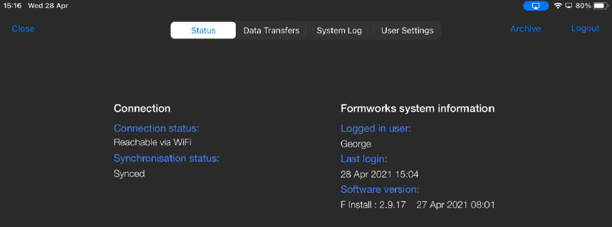 This displays information relating to the device user; their FORMS account name, the date and time of their Last login, and the Software version of the FORMS application.