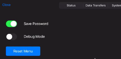 Selecting the Cog Icon at the bottom of the menu screen takes the user to the Settings Screen. This screen is split into four tabs, the Status, Data Transfers, System Log and User Settings: