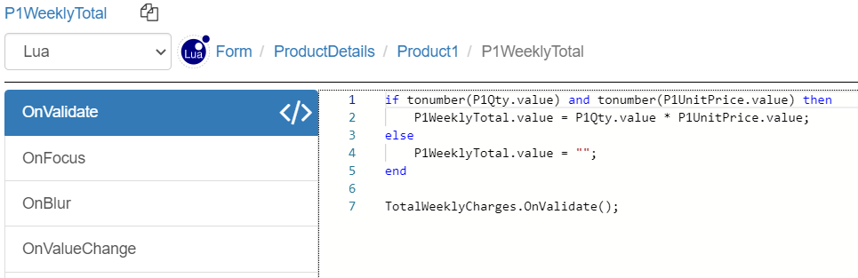 The following example is quite typical. Changing the values within a number of fields, such as quantity and price, can cause the total to automatically update. To achieve this, you place the calculating code in the OnValidate event of the total field, and call the OnValidate event from the OnBlur event of the quantity and price fields. This method causes the value of the total to be updated as the user exits the fields that are involved in the calculation.