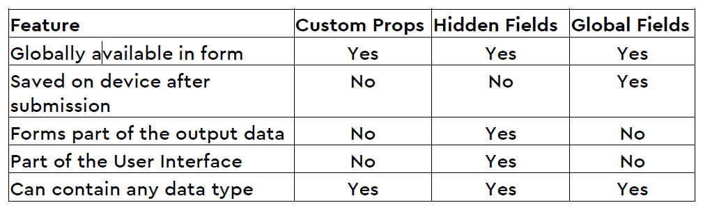 Custom properties can be used instead of Hidden fields, in a situation where the value doesn’t need to (or mustn’t) be submitted and exported along with the rest of the field data. They can contain other data types in addition to text. See the comparison chart below for a comparison between the features of Custom properties, Hidden fields and Global variables.