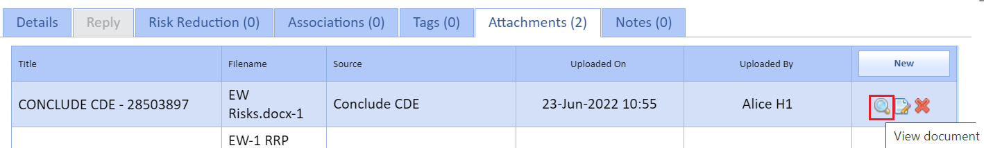 - The documents will be attached to the event. Clicking the magnifying glass next to each document will open