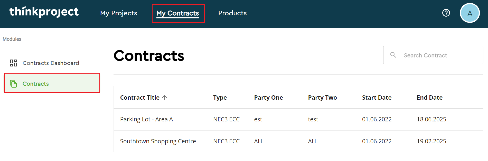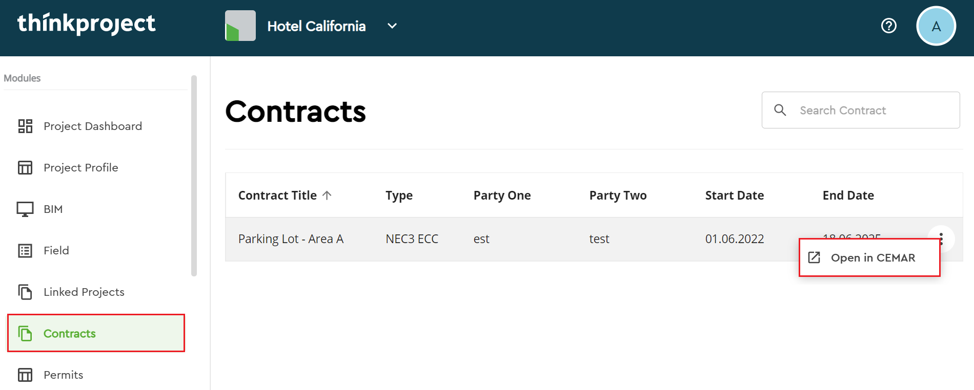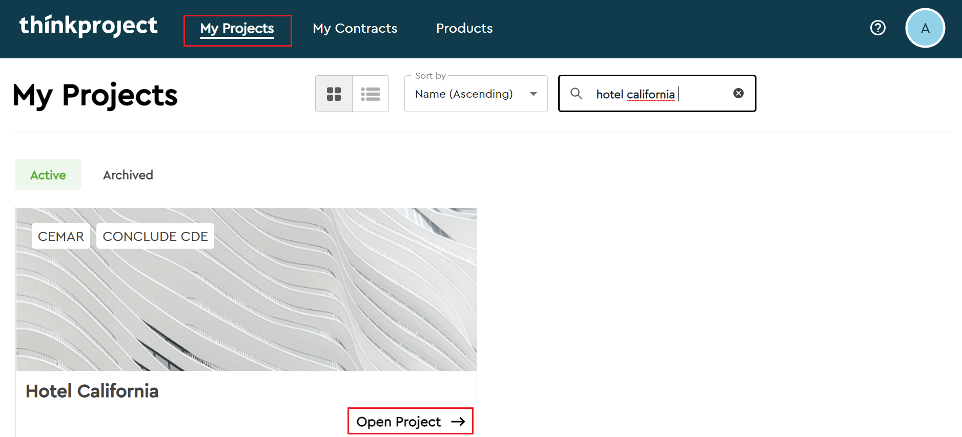 Alternatively, you can first locate the desired Thinkproject CDE project in the My Projects tab, click Open Project followed by Contracts and then access the linked contract from here.
