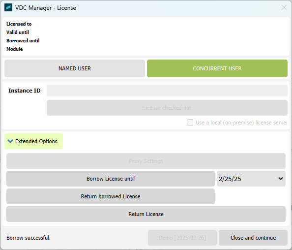 If you want to use the license without internet connection, you have the possibility to borrow a license ID. To do this, click on Extended Options on the CONCURRENT USER tab and then on "Borrow". Specify the duration of the borrowing here.