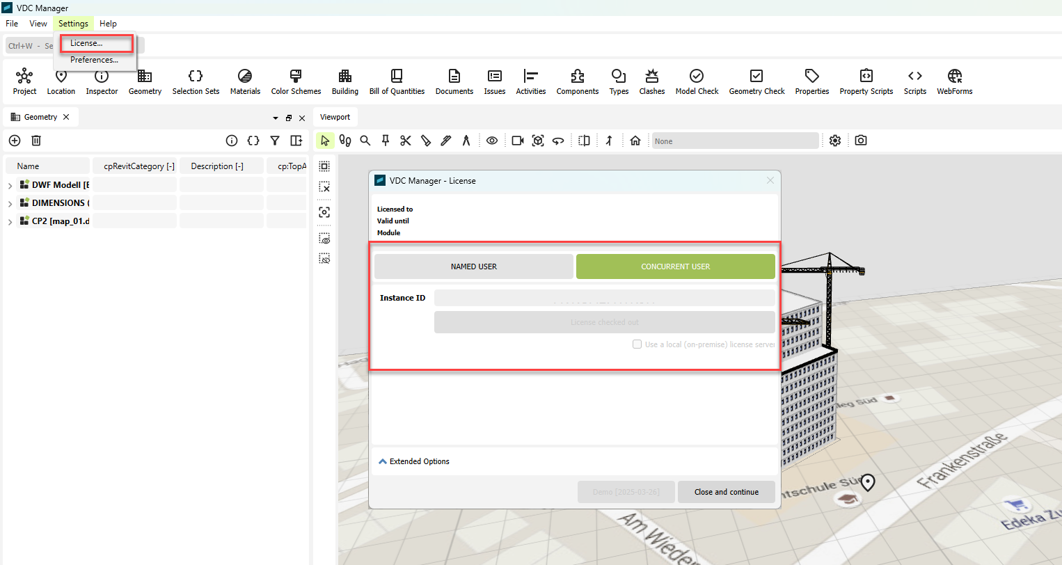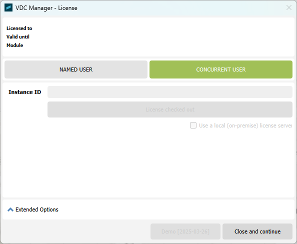 The activation of the license is done by an Instance ID. This consists of 12 characters and contains both letters and numbers (without hyphen). To activate the license or to start VDC Manager, an active internet connection is required. The validity of the license depends on the duration of the contract. If the contract is renewed, a new instance ID is not required.